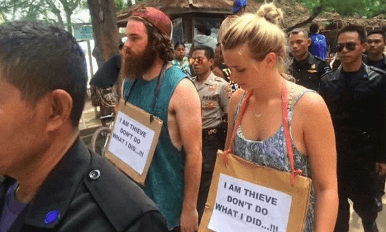 Australian 'thieves' paraded with signs on Indonesian streets (from the Guardian) - that's on one of the three Gili islands a couple of hours boat ride from here. There are no police there. This is done by the locals. I recall reading shaming is more effective than jailing. We love the Gilis - no cars, motorbikes, or dogs. What a relief. In the province of Lombok next to Bali.